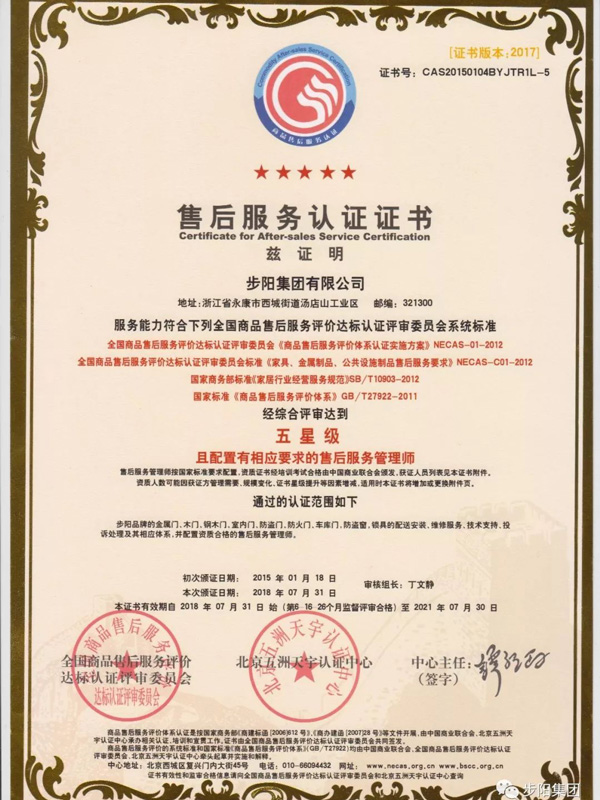 近日,在"全國(guó)商品售后服務(wù)體系項(xiàng)目"專(zhuān)家組評(píng)審中,步陽(yáng)集團(tuán)有限公司在金屬門(mén)、木門(mén)、鋼木門(mén)、室內(nèi)門(mén)、防盜門(mén)、防火門(mén)、車(chē)庫(kù)門(mén)、防盜窗、鎖具的配送安裝、維修服務(wù)、技術(shù)支持、投訴處理及其相應(yīng)體系在內(nèi)的全程售后服務(wù)內(nèi)容,并配置資質(zhì)合格的售后服務(wù)管理師,順利通過(guò)了國(guó)家級(jí)4大評(píng)審標(biāo)準(zhǔn),綜合評(píng)審達(dá)到“五星級(jí)”!
